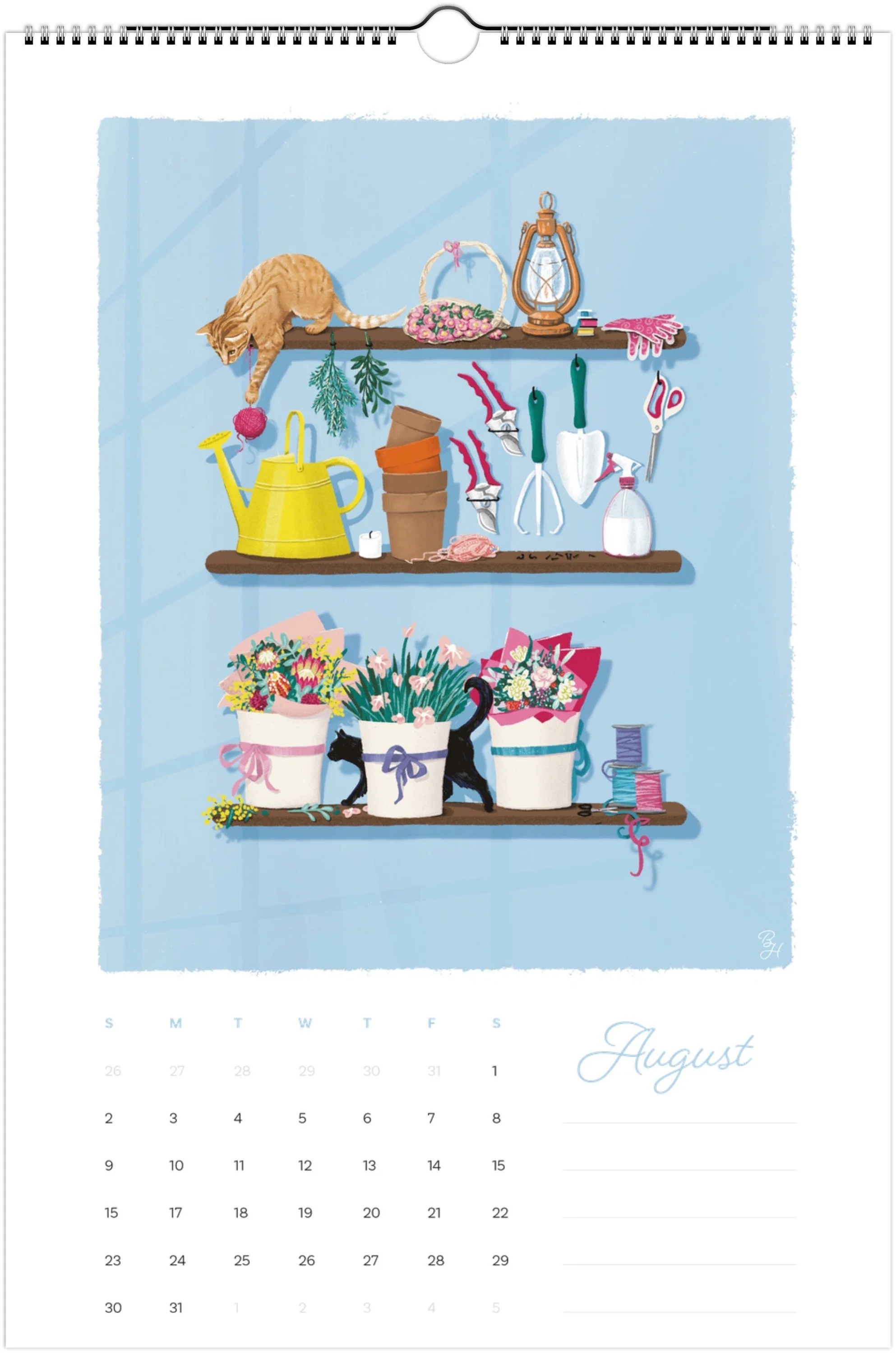 Open up my new illustrated 2026 calendar to a year of cheeky cats, bright colours, and quiet moments with my new 2026 “Cats in the Flower Shop” wall calendar, a celebration of feline mischief and botanical beauty. Each month brings a fresh illustration of curious cats with flower arrangements, vintage vases, tea cups and leafy corners of a dreamy florist’s shop. Designed and illustrated by artist Belinda Heather. Each month contains a cheeky cat or two, doing something very cat-like in a flower shop. Some cats are asleep, some are playing with string and others are likely to tip over a flower pot! Perfect for home offices, kitchens, or creative studios and anyone who loves cats, gardening and flowers.