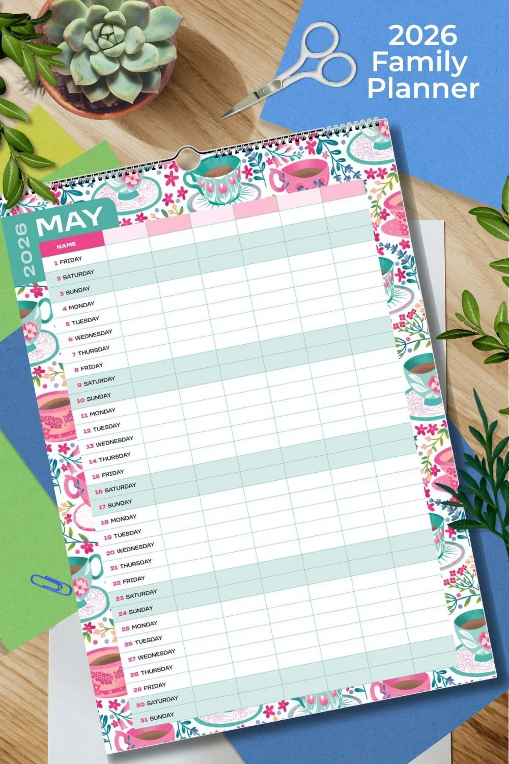 This calendar is available in 4 or 6 columns, so you can choose the layout that best suits your household. Whether you’re organising a small family or juggling multiple schedules, the clear monthly format makes it easy to write in names, activities and important dates without things feeling crowded or confusing.